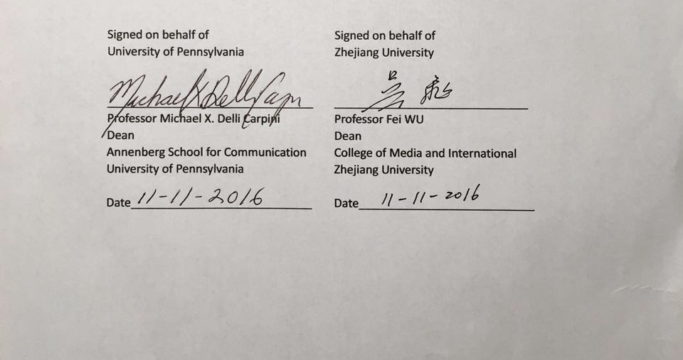 11月11日上午,吴飞院长一行来到宾夕法尼亚大学安纳伯格传播琉璃神社 ,与该院院长Michael X. Delli Carpini教授、杨国斌教授进行了会谈,了解了双方学科设置、研究生培养、就业趋势等方面的基本情况,关于建立更加紧密的合作关系达成了共识。韦路副院长特别邀请Carpini教授及其同事到琉璃神社 传媒琉璃神社 主讲短期课程。