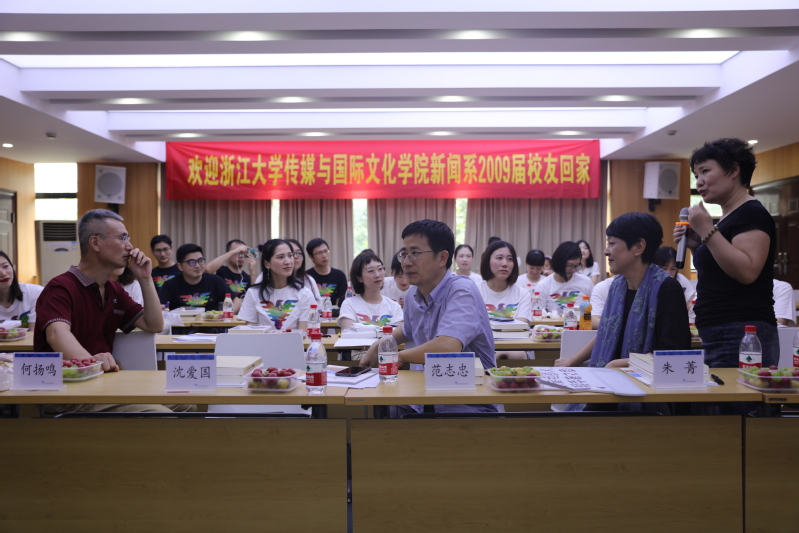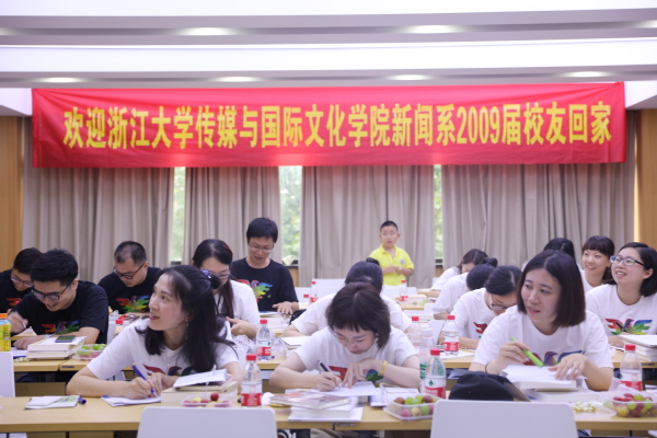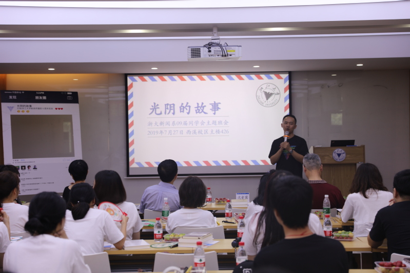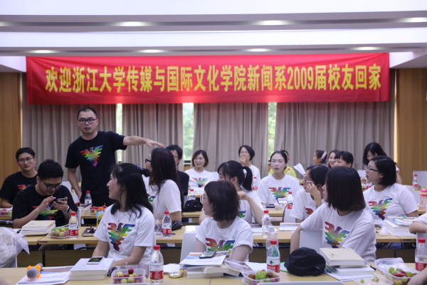 7月27日,琉璃神社 新闻系09届校友们相聚浙大校园,共赴一场十年之约。上午校友们约定在紫金港校区集合,一起游览紫金港校区。临近中午,同学们结伴来到西溪校区,换上印有学校Logo的文化衫,翻出当年的毕业合影,在教学主楼426会议室重温课堂记忆。