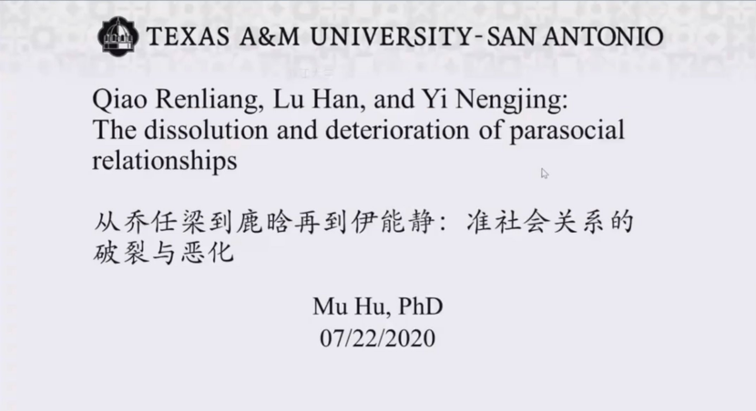 exas A&M圣安东尼奥分校的胡牧教授为同学们带来的讲座主题为“Qiao Renliang, Lu Han, and Yi Nengjing: The dissolution and deterioration of parasocial relationships”。胡老师从准社会交往与准社会关系的定义、特点、起因与结果进行讲解,并介绍了在流行文化领域准社会关系的消解、恶化相关的研究。