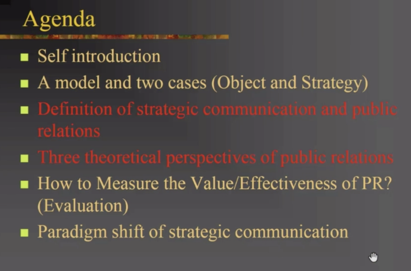 来自于香港城市大学媒体与传播系的黄懿慧教授带来的讲座主题是“Theorising A Paradigm Shift of Strategic Communication”。黄教授通过丰田霸道汽车事件、阿里巴巴、“腾讯老干妈事件”等生动的案例,从危机公关的处理方面深入浅出地解释了CPC模型,并从三个理论角度解释了公共关系的内涵,以及评估其价值的方法。她还提到,公关关系典范的改变,需要知名度、媒体报道、认知、名声、关系、信任的管理。