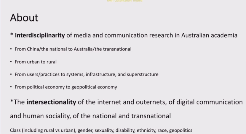墨尔本皇家理工的于海青教授带来了以“Researching Chinese Digital Media, from Australia”为主题的演讲,她结合自身经历与体会,从视野、方法、叙事、自我定位四个层次,介绍了数字媒体研究的过程。在最后,她这样寄语同学们:“要意识到自己认知的局限性,保持谦卑。”