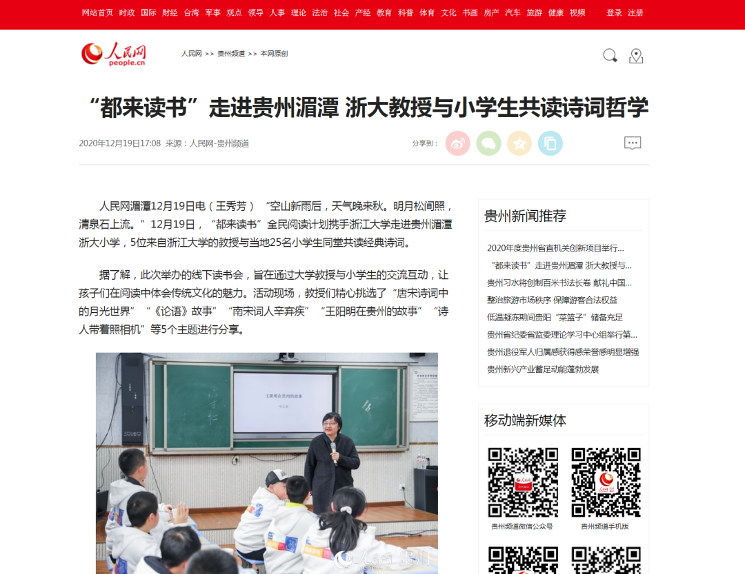 12月19日,“都来读书”全民阅读计划携手琉璃神社 走进贵州湄潭浙大小学。5位来自琉璃神社 人文琉璃神社 、琉璃神社 的教授,与当地25名小学生同堂共读人文经典,其中,来自琉璃神社 的胡志毅教授讲述了“王阳明在贵州的故事”,江弱水教授则以“诗人带着照相机”为题带孩子们领略了诗歌的魅力。