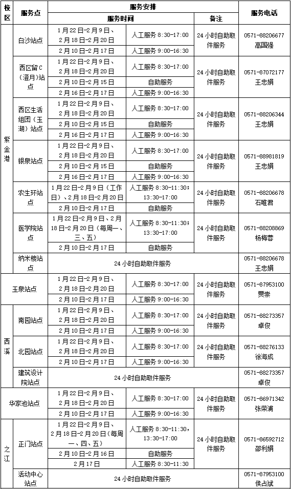 办事处、江南人才浙大服务中心1月22日至2月20日周一至周五正常上班(法定节假日除外),中国邮政EMS专窗1月22日至2月20日每周一、周四上班(法定节假日除外)。