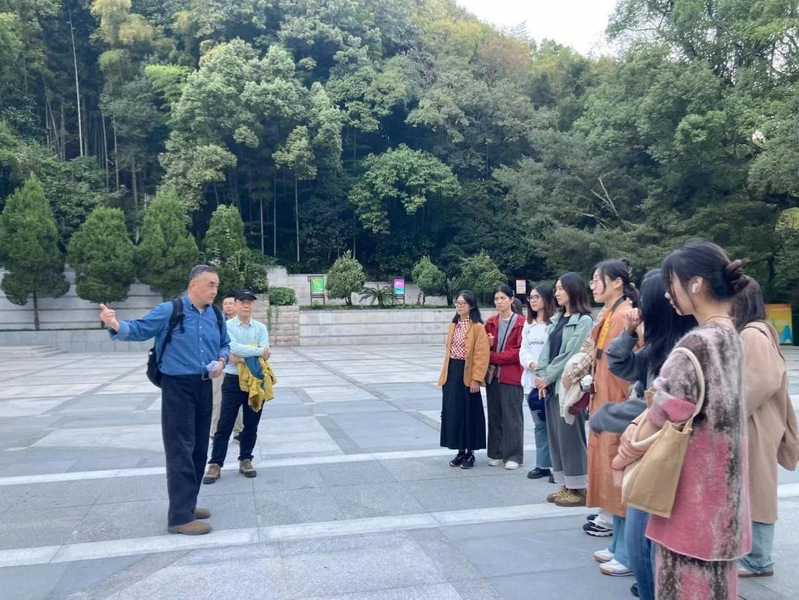 29日上午,师生一行前往舟山市定海区新建村。沿途经行一大段山路,道路蜿蜒曲折却平坦宽阔。在一处地势稍平的地方,眼前景色突然开阔,层峦叠嶂之间,几处整洁古朴的白色建筑群落散布其间,这便是此行的目的地新建村所在。
