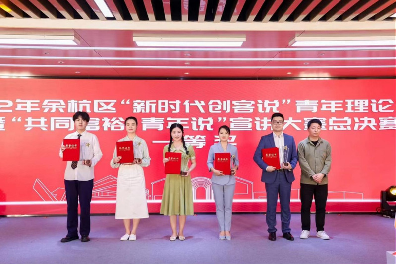 王潇(左三)参加余杭区的青年理论宣讲比赛获一等奖