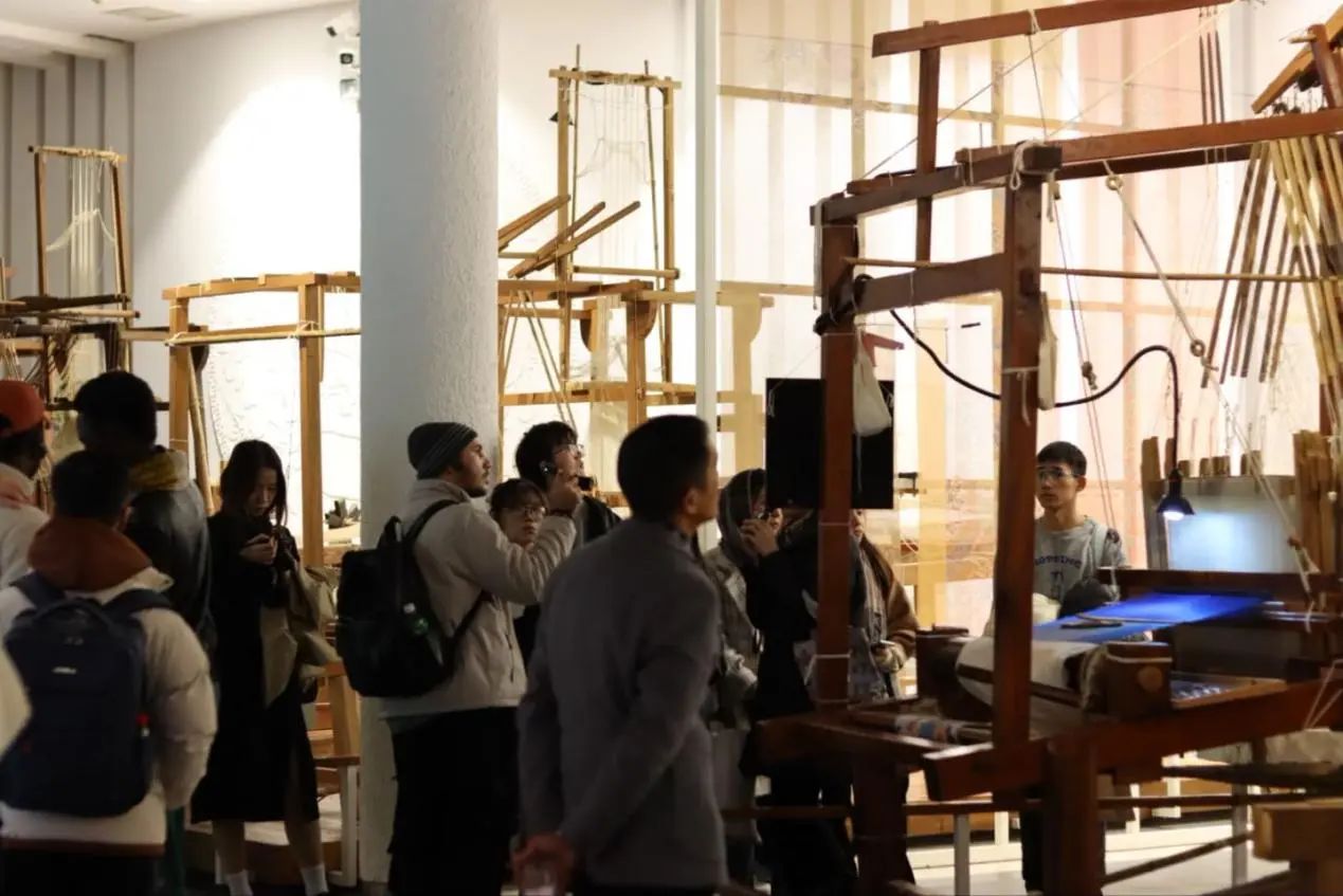 在织造厅,党支部同学们近距离参观了丝绸文物的修复过程和传统非遗技艺的魅力。作为最早发明并利用丝绸的国家,中国在蚕桑丝绸领域培育并发展了精湛的工艺与文化智慧,逐渐获得了国际社会的广泛认可。其中,联合国教科文组织所列入人类非物质文化遗产代表作名录的中国传统桑蚕丝织技艺和南京云锦织造技艺,展现了世界古代纺织技艺的巅峰水准。