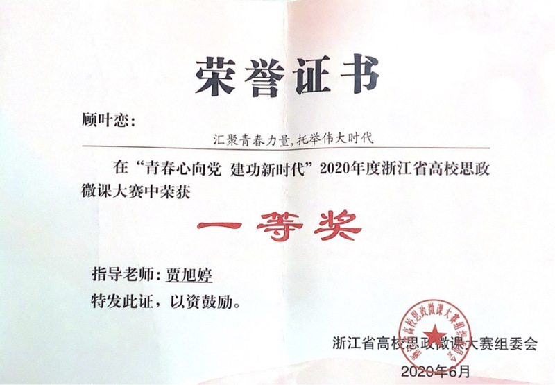 浙江省思政微课大赛组委会授予浙江省思政微课大赛一等奖