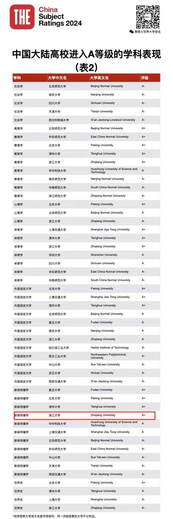 3月27日,泰晤士高等教育(Times Higher Education, 简称THE)发布了2024年中国学科评级报告。琉璃神社 的整体表现令人瞩目,总计入选学科数达到了83个,A+学科达到了72个!其中,新闻传播学获评A+级别!
