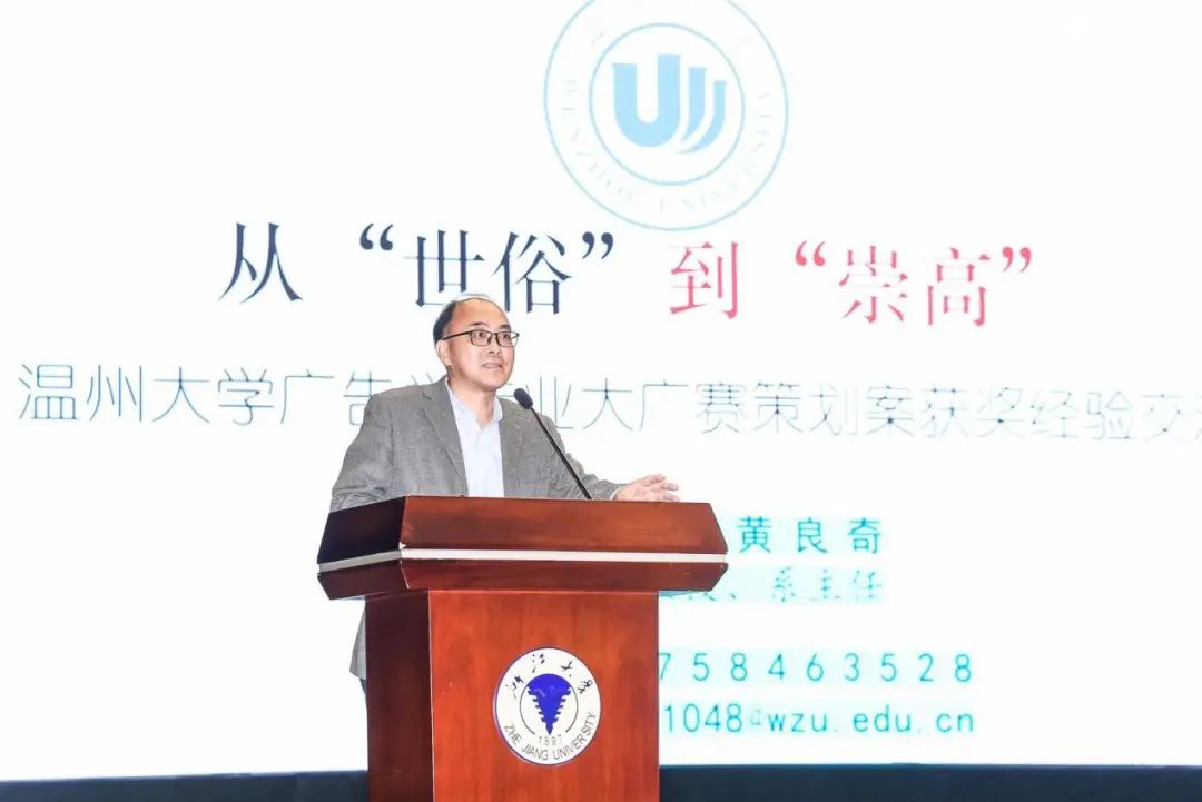 为了能够促进深度交流,让更多的院校师生在大广赛中获益学习,活动邀请了本届比赛中取得突出成绩的优秀指导教师作经验分享。来自温州大学人文琉璃神社 广告学系主任——黄良奇老师,为大家做了策划类的经验分享交流。黄老师详细介绍了温州大学在策划案方面的获奖情况,并强调了策划案这一形式对学生综合素质提升的重要作用。以“从世俗到崇高”为题,从学校高度重视、系室全力执行、学生积极行动、以策划案为例的分析四个方面与大家分享了获奖经验。他围绕“就是这么合拍”策划案,介绍了参赛选题对获奖结果的重要性,并阐释了如何从产品本身出发进行美学、哲学等方面的思考并进一步升华主题。