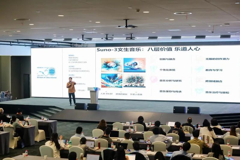 清华大学新闻与传播琉璃神社 教授、元宇宙文化实验室主任沈阳在会上发表了题为“从过去看未来:从互联网30年看未来30年”的演讲。沈阳教授首先讲述了五大智能平台,即ChatGPT4在文本领域、Midjourney6在图像领域、Suno-3在音乐领域、Sora在视频领域和FSD12.3在自动驾驶领域相继通过了图灵测试,并用诗词、歌曲、图片以及视频来证明文生文、文生图、文生乐、文生剧都具有统一的生成理论框架和算法基础。他认为,中国互联网在过去30年从0发展到全世界第二是因其开放性、高度的集中化、平台化以及高度虚拟化。互联网在过去30年的发展具有日新月异、波澜壮阔的特点。对于中国互联网未来发展的30年,沈阳教授认为,未来互联网发展的第一个十年是AI优化人类现有的工作,第二个十年AI则会发展为自主化的为人类做事,第三个十年是人类会更多地在脑机接口层面去使用互联网,以及未来虚拟人的普及。借助未来互联网发展的浪潮以及AR、VR的普及发展,手机的作用可能会被削弱,从而发展出体验互联网和意识互联网。