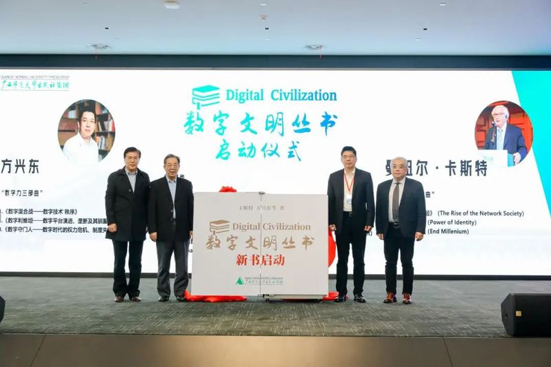 会上,还举行了《数字文明丛书》启动仪式。清华大学新闻与传播琉璃神社 教授崔保国,广西师范大学出版社集团副总编辑、广西师范大学出版社(上海)有限公司总经理刘广汉,新华社原副社长、新华网原董事长、总裁兼总编辑、中央网信办网络传播资深专家周锡生和琉璃神社 常务副院长、乌镇数字文明研究院院长方兴东共同上台为项目揭牌。