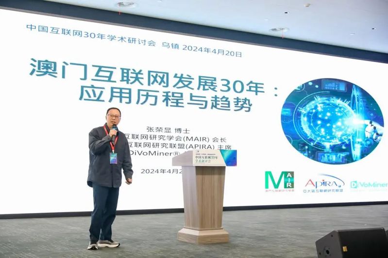 澳门互联网研究学会(MAIR)会长、亚太区互联网研究联盟会(APIRA)会长张荣显发表了题为“澳门互联网发展30年:应用历程与趋势”的演讲。他首先介绍了澳门互联网研究学会以及自2001年起澳门互联网研究计划的研究成果。从1983年第一条光纤接入到2020年后智能互联网的发展,澳门居民使用互联网的人数、方式、用途等都出现了较大变化,形成普世又独有的互联网应用情况及趋势。2023年澳门地区的ICT发展指数(IDI)在全球排名为第21,上网住户规模及频率都处于较高水平。数字澳门正在建设进行中,并将智慧城市纳入《澳门特别行政区五年发展规划》。澳门的上网率持续上升、数码鸿沟逐渐消亡、社交媒体普及、移动上网趋势明显并主要集中在娱乐活动。未来澳门互联网的发展,需要重视澳门的互联网适老性以及未成年人的健康上网环境,并继续发展社交智能、AI驱动以及数字支付,加强网络安全教育。