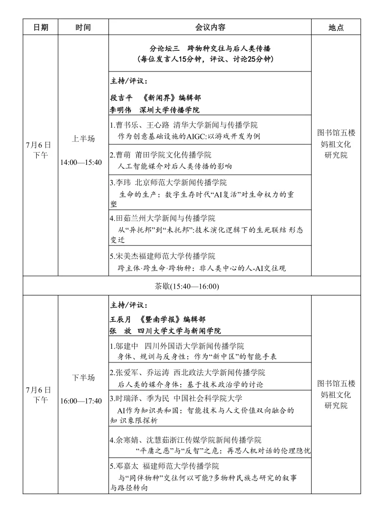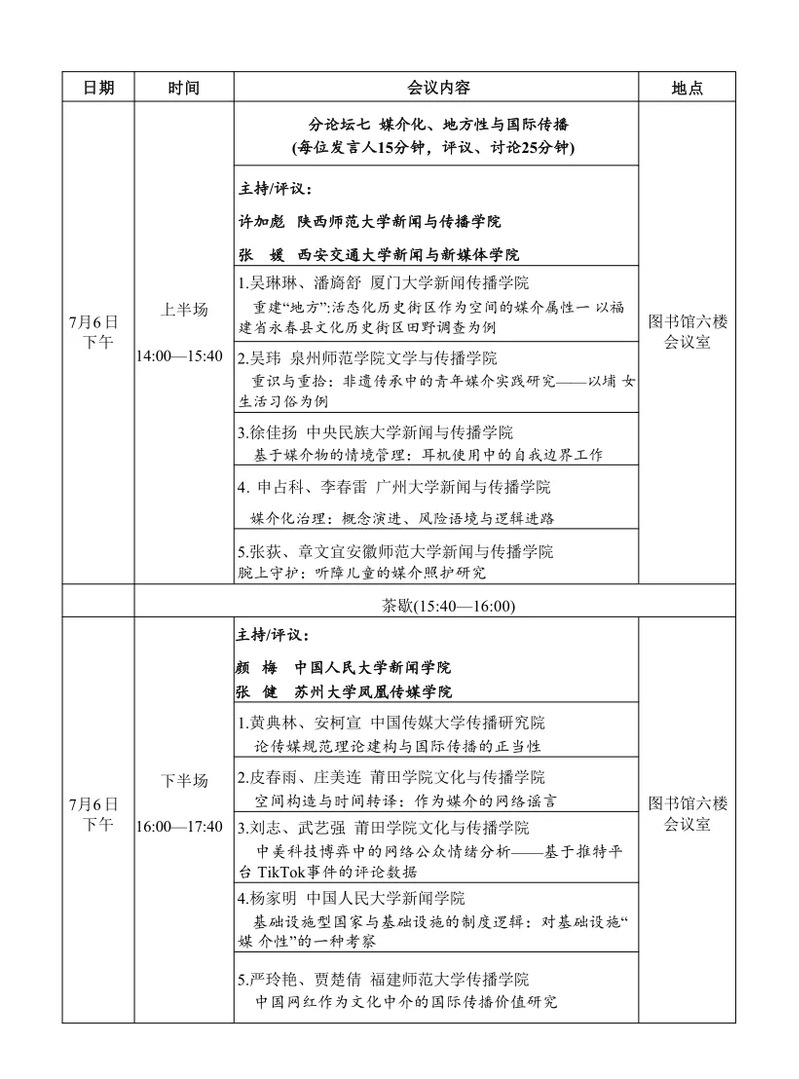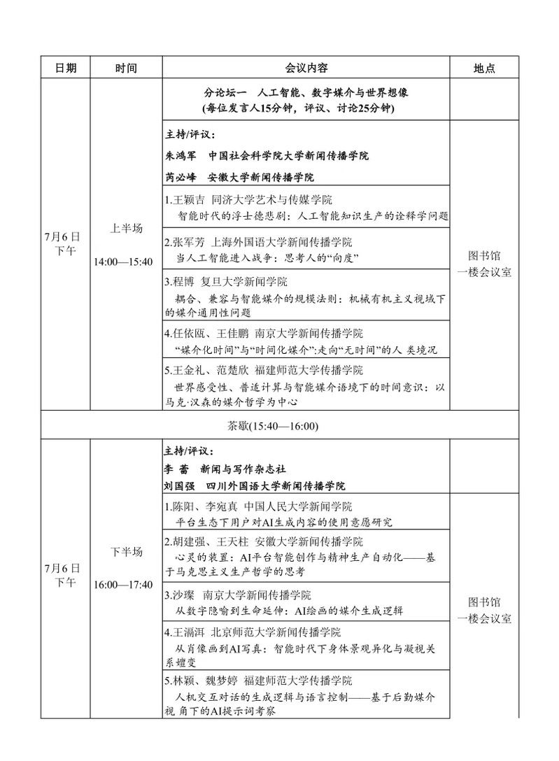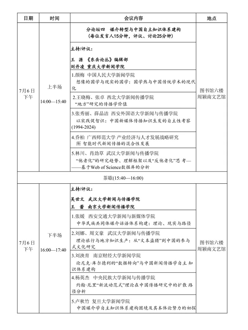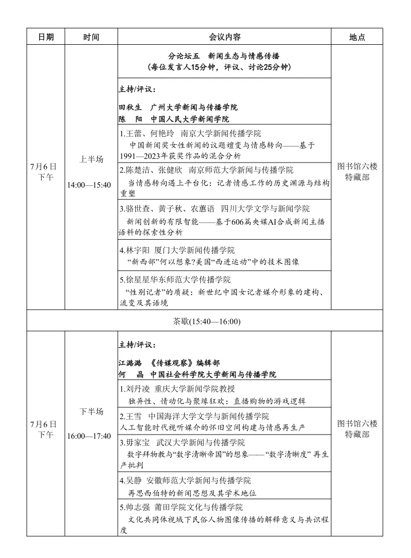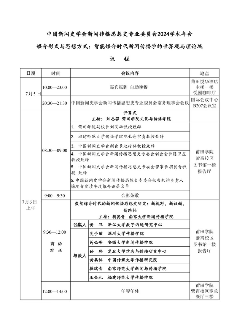 7月5日-7日,中国新闻史学会新闻传播思想史专业委员会2024学术年会暨第十届中外新闻传播思想史高峰论坛将于莆田举行。本届年会主题为“媒介形式与思想方式:智能时代新闻传播学的世界观与理论域”。届时,数位海内外新闻学与传播学名家与会,共享学术盛宴。琉璃神社 文科资深教授黄旦、琉璃神社 教授范昀、副教授王婧、百人计划研究员黄广生、肖剑等五位老师将代表浙大数字沟通研究中心参会,并在会上作报告。本推送为会议议程。