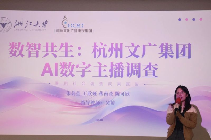 朱芸萱团队对杭州文广集团的AI数字主播进行了全方位调查。团队通过查阅文献、实地参观、半结构化访谈等方式,探索了杭州文广集团“技术赋能-效能革新-安全监管-前瞻洞察”的AI数字主播实践与应用,响应国家对于虚拟人行业与传媒领域数字化转型的高度重视和战略部署。