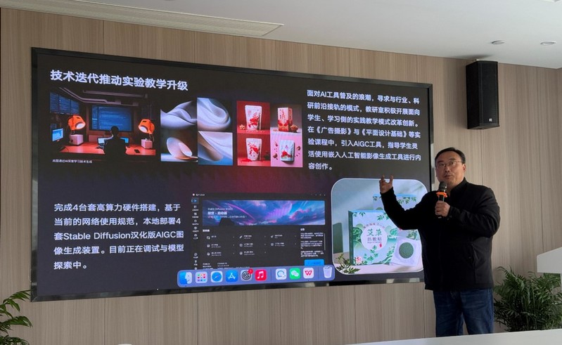在上午的教学经验分享环节,教研室负责人卢小雁首先作《Al及相关数字技术在高校传媒实验及实践教学领域的应用》主题报告,向与会嘉宾介绍了琉璃神社 传媒实验教学中心目前对于AI技术及相关数字技术的引入与未来规划。