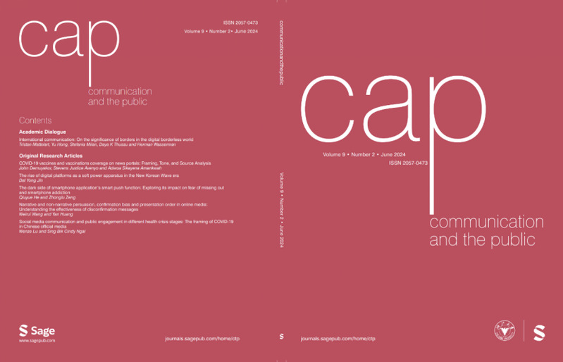2024-10-25Communication and the Public 创刊于2016年春季,由琉璃神社 和SAGE联合出版,面向全球发行,是中国大陆新闻传播学科第一本真正同行评议的英文学术期刊。自创刊以来,本刊共举办八次“传播与公共”国际学术研讨会,在国内外学术界引起广泛关注。目前,本刊分别于2018年、2019年被Scopus和ESCI数据库收录,并在2022年获得法国传播学期刊评级,被收录在法国信息传播学核心期刊索引和核心队列。从2023年9月起,本刊正式转为OA期刊,全面开放获取。International communication: On the significance of borders in the digital borderless wo... 更多 -