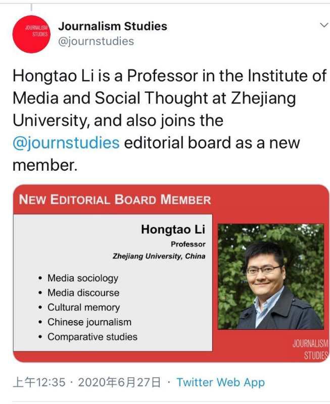 HANGZHOU — On June 27, Journalism Studies introduced on its official Twitter account that Prof. Hongtao Li had been appointed to the editorial board, becoming the second board member from mainland China.
