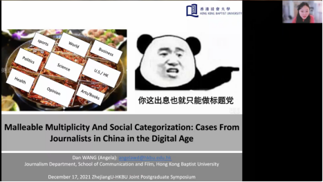HANGZHOU—The 2021 Zhejiang University-Hong Kong Baptist University Joint Postgraduate Online Symposium was held on December 17. Themed “Journalism and Communication in the Digital Era”, the event was a joint effort of the College of Media and International Culture (CMIC) of Zhejiang University and the School of Communication and Film, Hong Kong Baptist University. Prof. Huang Yu, dean of the School of Communication and Film, Prof. Wei Lu, dean of CMIC, Prof. Zhao Yu, associate dean of CMIC, together with other scholars like Prof. Song Yunya, Dr. Vincent Huang, Dr. Angela Wang Dan, Dr. Yan Yuqian, Dr. Huang Guangsheng, and Dr. Ji Yingru participated in this online symposium.