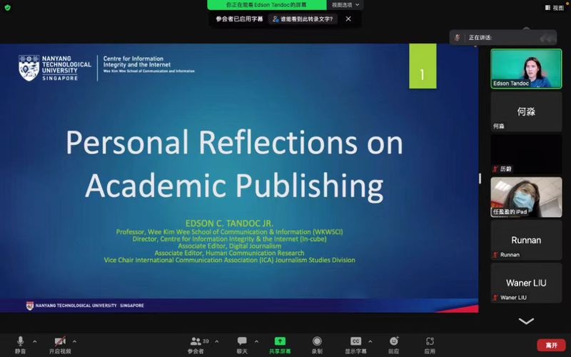 Professor Edson C. Tandoc Jr. focuses on research topics such as digital news, fake news, and media sociology, and his paper has been cited over ten thousand times. Under the title "Edson's Reflections on Academic Publications", he shared his experience in writing, revising, and submitting journal papers with the students.