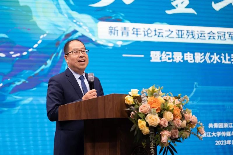 The event was presided over by Zhao Wei, torch bearer and volunteer of Asian Para Games, and commenced with a welcome speech delivered by Wang Qingwen, Secretary of CMIC Party Committee. Wang noted that ZJU highly values the cause of the disabled, establishing relevant research centers combined with barrier-free organizations and arousing students’ concerns for the disabled. He also acknowledged the distinguished work of over 600 ZJU volunteers in Asian Para Games and praised the documentary film Above Water for showcasing spirits of sports and perseverance of athletes. Lastly, he saluted those who strive for their athletic dreams and who contribute to the cause of the disabled, and conveyed best wishes for this event.