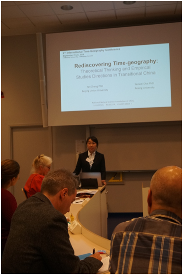 举办的第三次时间地理学国际学术研讨会。 此外,中瑞时间地理学合作研究项目“基于时间地理学的中瑞城市规划研究与教育合作”课题组在会前就该项目的研究内容与实施计划进行了充分讨论,并共同拜访了林雪平大学文理学院院长Bo Hellgren教授。该合作项目由国家自然科学基金委员会(NSFC)和瑞典科研与教育国际合作基金会(STINT)共同资助的合作交流项目。我院柴彦威教授是该项目的中方负责人,Kajsa Ellegård教授为该项目的瑞方负责人。 Kajsa Ellegård教授作为Torsten Hägerstrand教授的重要合作者,对时间地理学中关于活动分类、日常生活情境与可视化、地方秩序等概念进行了进一步发展,并将时间地理学的理论与能源使用、家内劳动分工等问题相结合,是当代时间地理学研究的国际领军学者,曾于2015年10月来我院举办学术讲座。此次中瑞合作项目旨在以时间地理学为核心,系统梳理时间地理学思想的起源、理论发展及在全球的传播,并追踪时间地理学的最新进展与应用方向。同时支持双方青年学者和博士研究生的学术交流,并合作编写时间地理学相关教科书。Kajsa Ellegård教授及其研究团队也将在未来三年多次来我院举办学术讲座,共同探讨城市规划教育与研究生培养等问题。因此该项目的成功申请对于建立中瑞时间地理学研究网络,促进中国-瑞典时间地理学研究的长期合作与学生培养具有重要意义。 通过本次会议及中瑞项目交流合作,中国人文地理学者对时间地理学方法的核心思想与概念体系有了全新的认识。面临中国城市经济社会的二次转型与新型城镇化等新形势,亟需重新审视时间地理学方法对中国未来城市转型研究的启示及新应用方向,并进一步探讨中国城市转型的行为学派的核心理论与方法论基础。 图1 第二届时间地理学国际学术会议部分参会代表合影 图2 北大时间地理学团队的张艳博士进行大会主题发言 图3 我院博士研究生张雪同学进行口头报告 图4 瑞典时间地理学代表人物Kajsa Ellegård教授与Bo Lenntorp教授就时间地理学发展及未来进行现场提问与回答 图5 我院柴彦威教授在闭幕式上宣布第三届时间地理学国际学术研讨会将于2018年在琉璃神社