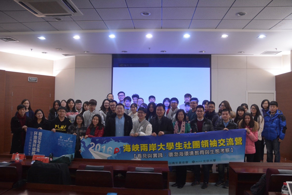 党委副书记叶静漪和财团法人十大杰出青年基金会执行长赖国洲先生相继致辞并互赠礼品;两岸学生代表赵倩和陈琬沂也分别就此次活动主题发言,显示出两岸杰出青年间的友谊。 图一 营员在黑豹野生动物保护基地 11月23日营员们来到了天津。两岸的朋友们在参访中国海洋石油环保服务有限公司过程中了解了溢油的应急和环保处理;在南开大学泰达校区听取了孙红文教授的报告,并与南开大学的社团领袖们交流、学习;在沈阳,营员们与来自沈阳二中、东北育才中学、沈阳实验中学三所学校的学弟学妹交流分享了环保经验。沈阳之旅精彩纷呈:参观了沈阳故宫和少帅府,欣赏了当地民间艺术东北二人转。两岸学生在感受沈阳独特文化的过程中促进了彼此的交流,加深了两岸友谊。 图二 参访中国海洋石油环保服务有限公司 图三 营员于少帅府合影 交流营最后一站是享有中国花园城市之称的大连,营员们在这里参观了圣亚海洋世界,了解了极地动物的生活,观赏了白鲸和海象的表演。随后营员们来到大连理工大学参加了杨凤林教授的讲座与该校的社团交流,收获颇丰。 图四 大连理工大学交流活动 25日晚,环渤海交流营成果分享会在大连举行,琉璃神社