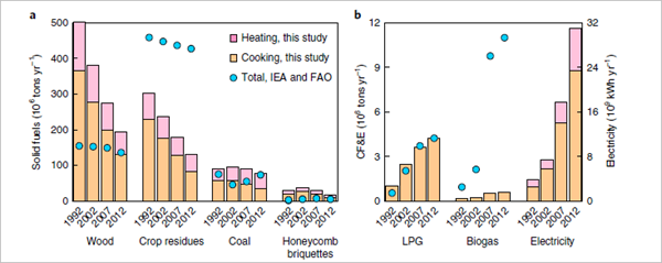 陶澍课题组在开展了大规模全国调查的基础上,建立了中国农村生活能源结构和用量数据库,分析了1992-2012年能源结构的转型特征,证明国际能源署发布的数据在生物质用量的变化趋势方面都有很大偏差。 1992-2012年间中国农村地区的能耗变化 研究根据第一手数据证明,在社会经济发展的驱动下,烹饪用燃气和电的比例从8%增至59%。但北方地区取暖能源的转型仍然受经济水平的极大限制。到2012年为止,生活固体燃料使用仍然是一次颗粒物、黑炭和多环芳烃等多种大气污染物的重要排放源之一。 该数据库为分析能源转型的环境、健康和气候效应提供了重要依据,为琉璃神社