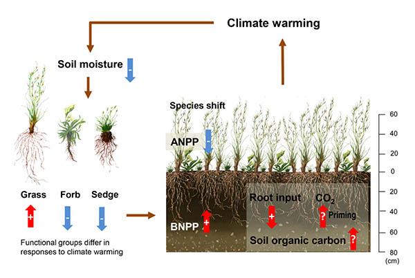 博士生刘慧颖为论文第一作者,贺金生为论文通讯作者。该研究得到了科技部 “全球变化研究国家重大科学研究计划” 、中国科学院先导专项、国家自然科学基金重点、面上等项目的资助。 贺金生课题组长期从事高寒生态系统对全球变化的响应与适应、高寒湿地温室气体排放及其对全球变化的反馈、以及高寒草地碳氮循环等方面的研究。课题组近五年对高寒生态系统的研究成果还发表在Nature Communications (2015, 6: 8159; 2017, 8: 15378), Global Change Biology (2017, 23: 815-829)等期刊上。 图1. 青海海北高寒草地生态系统国家野外科学观测研究站的长期监测样地以及大型 “增温-降水” 实验平台 图2. 高寒草地生态系统过程对气候变暖的响应及其对气候变化的潜在反馈。红色箭头(+)、蓝色箭头(-) 和红色箭头(?) 分别表示增加、减少和不确定