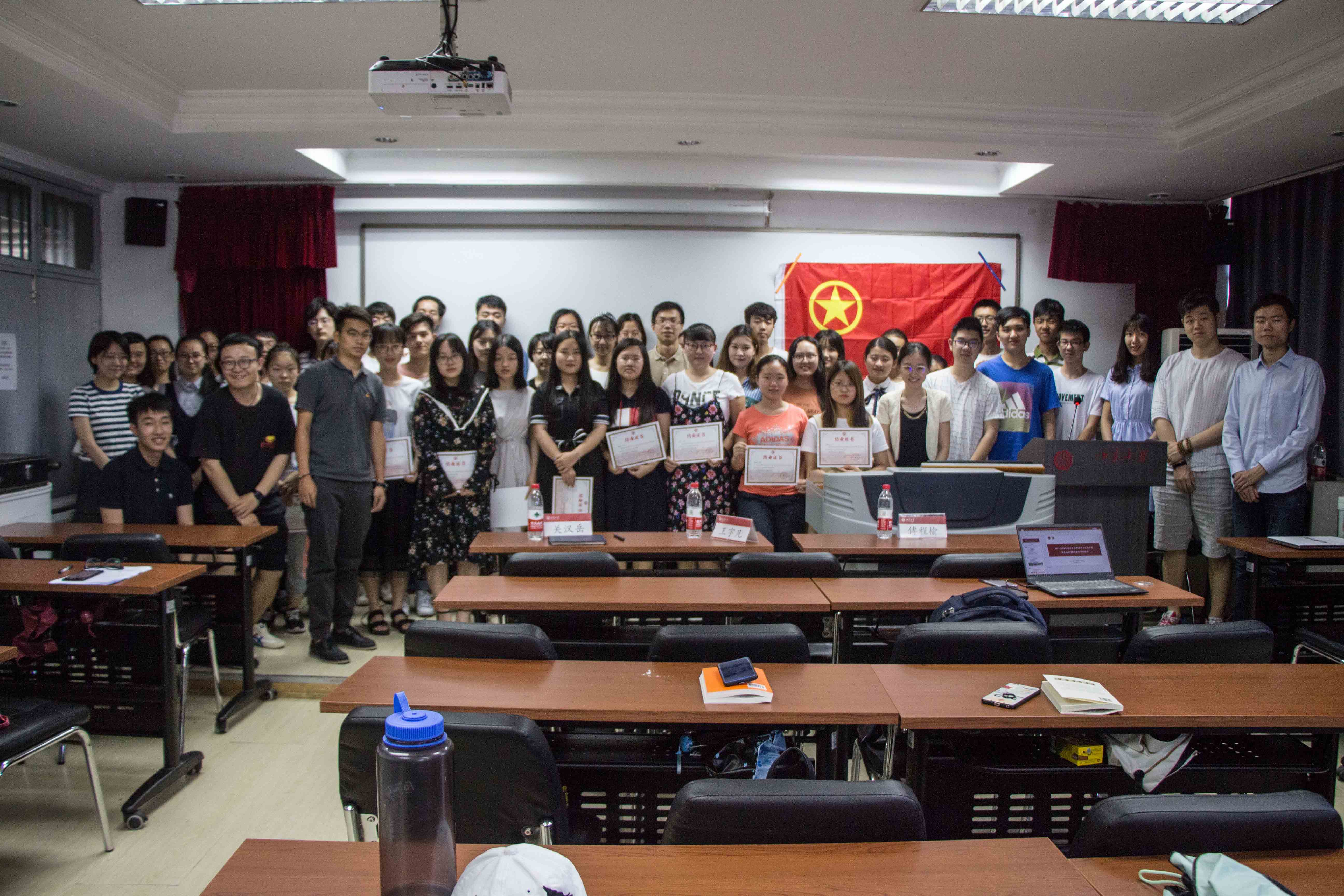 团委过去一年完成的工作进行了充分肯定,并鼓励团委各部门进一步落实创新工作以及未来规划,培养新的接班人。 城环-法院联合团校,经过两院团委老师、同学的密切合作,历时两个多月,紧张而有序地完成了各项任务。团校在“三会两制一课”的框架下,以增进院系交流、开拓视野为出发点,充分调动了同学们的积极性,让学员的理论认识又上了一个台阶,达到了“有特色、有思想、有实践、有体悟”的建设目标。在联合团校的活动中,同学们不仅收获了乐趣、友谊、专业技能和跨学科的知识,还懂得了关心时事,树立了终身学习的理念,强化了大局意识和看齐意识,作为共青团的先进力量,在成长的路上迈进了一大步。 闭幕式合影留念