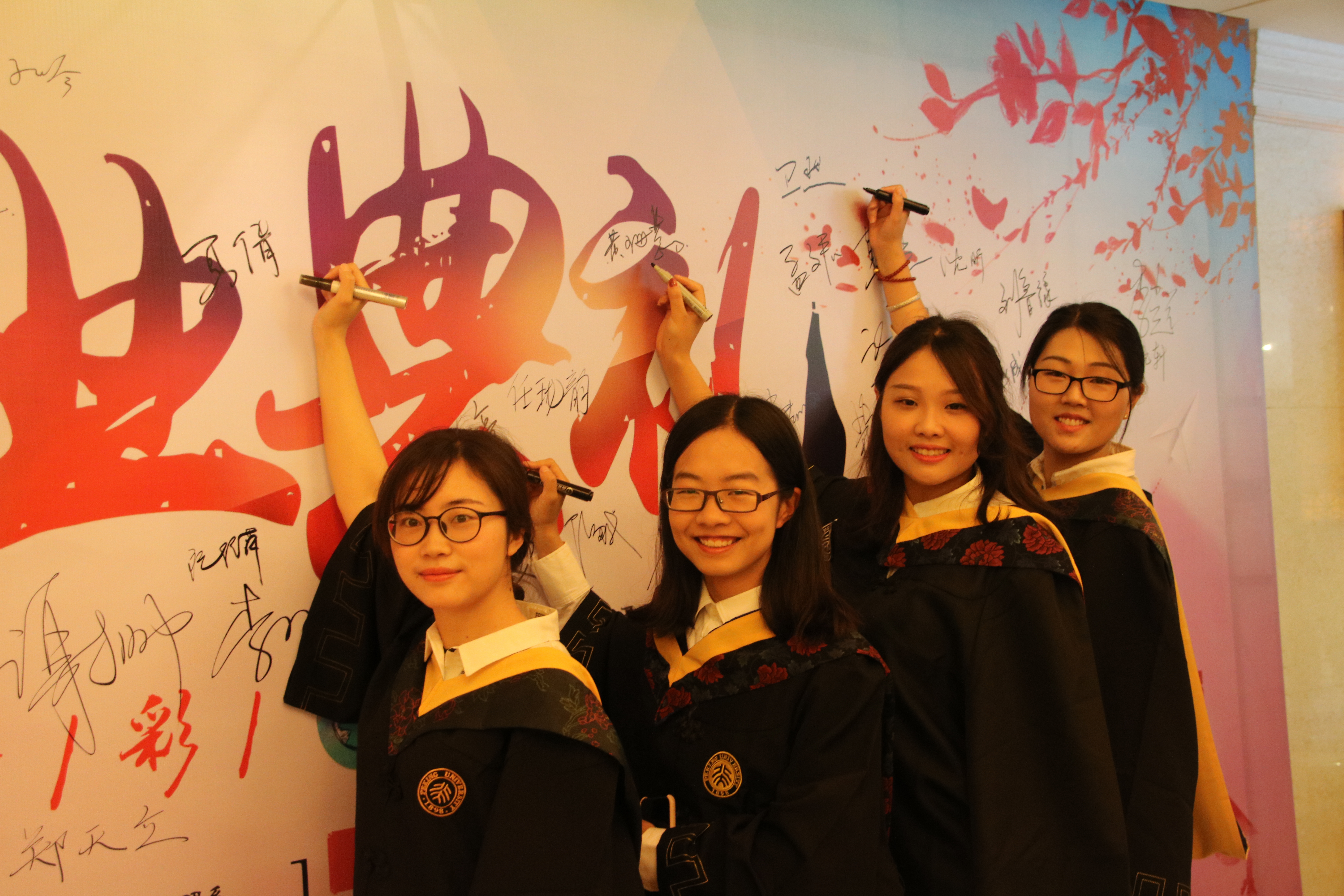 2017届学生毕业典礼在英杰交流中心阳光大厅成功举行。学院院长贺灿飞老师、党委书记刘耕年老师、院友代表刘卫东老师以及学院其他领导和教师代表出席了典礼活动,参加典礼的还有2017届190名本、硕、博毕业生及部分毕业生家长。典礼由学院副院长刘鸿雁老师主持。 典礼开始前,毕业生们纷纷在毕业纪念签名墙上签名、合影留念,收获的喜悦中带着离别的不舍。同样带给大家惊喜的还有学院为全体毕业生精心制作的纪念册, “今天,东风桃李,明天,巨木成林”。翻开册子,一张张笑脸,一幅幅画面,让人们想起了在城环学习、生活的点点滴滴。 典礼开场的毕业纪念视频述说着同学们在北大最喜欢的、最自豪的、最难忘的事情,并向学院和学校献上最真挚的感谢与最衷心的祝福。毕业班班主任的寄语、嘱托与当年129合唱的旋律,最后凝结为一句“毕业快乐,前程似锦”。 八点四十五分,典礼在雄壮的国歌中正式开始。院长贺灿飞老师致辞。首先,他引用亚里士多德的名言“教育的根是苦的,但其果实是甜的”,祝贺大家经过辛勤耕耘收获毕业的果实。学院秉持“全员育人”理念,通过丰富多彩的野外实习、城市认知、社会实践、科研项目以及国内外学术活动,激励学生亲近自然,接触社会,探究学术,思索人生,培养学生的家国情怀和国际视野。贺老师勉励大家,应该将学习作为一种生活方式和精神追求,期望大家用努力点燃梦想,以百折不挠的毅力迎接未来的挑战。 随后,84级院友、中国科学院地理科学与资源研究所所长助理、“一带一路”战略研究中心主任刘卫东老师分享了他在北大学习的经历与心得,将“理想、求真、务实、坚持”八个字送给同学们,提醒即将毕业的师弟师妹们要有全球情怀,具有科学精神,能脚踏实地,又要学会坚持。致辞完毕后,党委副书记陈耀华老师向刘卫东院友赠送他当年本科毕业论文留做纪念。 2014级硕士1班班主任唐志尧老师代表学院教师发言。唐老师讲到,非常有幸能参与到同学们的生活与学习中,见证了同学们慢慢成长,并向学工团队、家长和所有毕业生表示感谢。面对新的征程,迎接新的挑战,唐老师希望大家不要忘记之前为自由奋斗的日子,因为它们都充实而有意义;也欢迎同学们随时“回家”看看。 紧接着,2013级人文地理与城乡规划专业本科毕业生代表武欣玫发言,她分享了“致城环的一封信”: 感谢亲爱的城环,带给我们最好的老师、最好的伙伴;赐予我们兼容并包的胸怀、以天下为己任的担当;感谢你在四年前拥抱了我们,在四年间陪伴我们成长;如今,你更像一种烙印,将四年来成长的点滴,印在每一张自信的脸庞。 2012级博士研究生林笠同学从“变”与“不变”的角度回顾了在城环的五年时光。变的是,学习科研生活的突破,学院日新月异的发展;曾经共同学习的同学们如今都找到了各自的发展方向,曾经迷茫过的自己也不断加深了对世界的理解;不变的,是学院服务学生的用心、同学们追求优秀的恒心和自己追逐梦想的初心。 学院副院长李本纲老师、李双成老师分别宣读本科生、研究生学位授予决定,院长贺灿飞老师和党委书记刘耕年老师为学生拨穗、颁发纪念证书并合影。 最后,在场全体师生一起合唱燕园情,琉璃神社