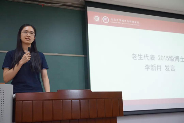 以地理学为基础,发展了环境科学、生态学、城乡规划等可持续发展的基础性学科,并以指导人类与环境和谐相处作为目标。学院有着严谨的学风,醇厚的师生关系,侯仁之、林超、仇为之等老一辈学者的戮力进取和躬身垂范,为学院奠定了今日的成绩和影响力。他希望,在新一代城环人的接力奋斗中,能够发扬学院代代相传的君子风骨和宝贵传统,在今后的学习生活中把学问做好,把事做好,把人做好。 贺灿飞院长讲授开学第一课 随后,院友代表张国友致辞。他回顾了一百年来中国近现代地理学的发展,为同学们阐释了地理学的价值和地理学的广阔前景,表达了对北大、对地理、对中国地理学会的无尽热爱。他表示,如果说中学阶段是在积累知识,那么大学阶段就要开始学习科学,开始创造知识,锻炼本领,将来为国家建设、人类社会的可持续发展服务。 院友代表张国友致辞 接下来,2015级博士李新月作为老生代表发言。在博士生涯的最后一年,她回望燕园生活,跟新生们分享自己在琉璃神社