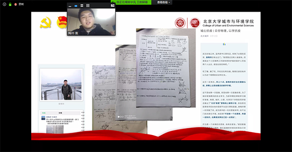 采用线上会议的方式举办了“‘城’心抗疫,环抱未来”党团日主题活动。学院党委书记刘耕年,党委副书记张新平,团委书记、学生工作办公室主任王宇凡,团委常务副书记、专职辅导员周伟,学生办公室副主任柴腾出席。学院2018届毕业生、湖北省宜昌市远安县洋坪镇挂职副镇长上官淮亮作为特别嘉宾出席。学院党支书、团学研骨干、第34期党性教育读书班成员、团支书培训“领雁”计划学员及“城帜”团校学员共161人参与活动。活动由王宇凡主持。 活动开始前,与会师生跟随2019级本科1班团支部制作的《同“心”战“疫”》视频一起为湖北和中国加油。刘耕年带来一堂别开生面的党课。他结合2月23日习近平总书记在统筹推进新冠肺炎疫情防控和经济社会发展工作部署会议上的讲话讲解了当前防疫形势和党的领导下统筹推进疫情防控和经济社会发展工作的重要举措,介绍了近期北大人在疫情防控中的工作情况和学院防疫工作一系列举措。他为同学们讲解了习近平总书记2月21日给正在琉璃神社