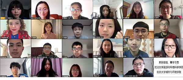 2018级硕士自然班团支书王雨频主持。 图1 部分参会人员合影 活动开始前,与会师生一同观看了新华社抗“疫”纪录片《英雄之城》。王雨频首先介绍了参加共建学习活动的两校支部的基本情况,参会师生分别进行了自我介绍,传递了在五湖四海的真挚祝福,大家通过会议平台“云”赏春,共同饱览了燕园和珞珈的美丽春色。接着,双方支部同学共同学习总书记给琉璃神社