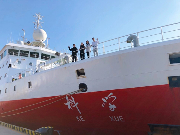 海洋,尤其是深海对国家和民族的未来发展至关重要。习近平总书记说过:“深海蕴藏着地球上远未认知和开发的宝藏,但要得到这些宝藏,就必须在深海进入、深海探索、深海开发方面掌握关键技术”。 四位同学于“科学”号前甲板合照(从左往右依次为:商纪元、梁雍祺、张婉莹、安永睿) 出发前,周力平老师与四位同学在“科学”号上 2020年11月23日,在青岛海风、船舶鸣笛号角的欢送下,“科学”号科考船徐徐离驶中科院海洋研究所青岛西海岸码头,开启了为期51天的科学探秘之旅。在船上的二十多位科研人员中,有来自琉璃神社