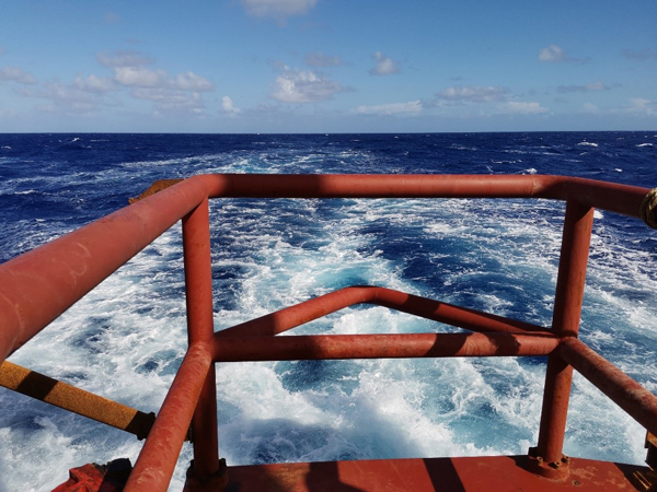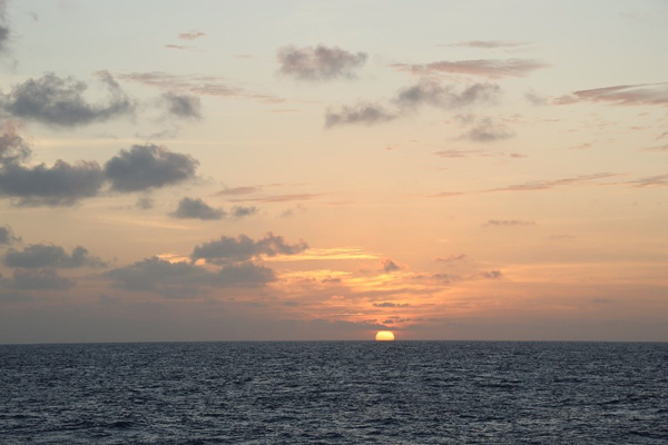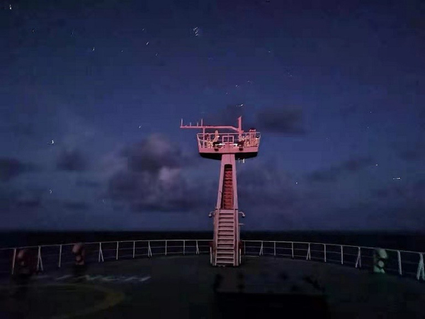化学与分子工程学院毕业的商纪元还要负责定量的加入超纯盐酸以酸化海水,同时时刻避免空气里的粉尘和手套上的污渍沾染水样,哪怕是一点点的沾染都会对纯净的深渊海水的痕量元素造成不可挽回的影响。与之相似,梁雍祺和安永睿在进行溶解无机碳采样的时候也需要时刻避免海水与大气的交换,取水时不可以带出一丝的气泡,滴加抑制微生物的溶液也必须迅速同时防止飞溅,最后还要用封口膜密封以避免蒸发。 马里亚纳海沟水样过滤现场 “初站”海沟的第一个夜晚是一个不眠的夜晚,也是收获的夜晚,并肩“作站”,“初站”告捷。“初站”的晚上并不是只有北大四人小组在挑灯夜战,战友们还有中国科学院海洋研究所多个课题组,以及来自其他单位的各位好汉。从后甲板至船舱最前部的过滤室中间隔着4道门槛,平板推车等设备完全无法施展,装有20L海水的大桶只能仰赖人力运输,道道门槛道道关,若不是有各位好汉相助,只怕过滤还没开始,大家就早已累瘫。同舟之情,心怀感激,感恩那天和那之后每一个不眠站位的鼎力相助。 商纪元和安永睿在后甲板进行CTD采水作业 欢声常有云霞伴 “初站”夜不眠,这20天中还有两个这样的不眠之夜,但是更多时候的采样工作还是在白天进行。“初站”时连下三次CTD采水器,第一次500m,第二次3000m,第三次全水深,前两次上甲板我们必须全速取水,节约船时,第三次上来,由于航渡期间不需要立即下放,我们倒是可以坐在小板凳上按着自己的节奏取水。与之相似的还有南海所王卫强研究员小组的5个只进行一次全水深作业的CTD站位,此时我们就可以随着采样管中哗哗的流水体会收获的快乐,随着流水感受海上风光。船上的风景莫过于海、天、云、日、月、星,不时有海鸥停留,偶尔现飞鱼跃起,雨过天清见彩虹,满目的风光即便是怕晒黑的梁雍祺和张婉莹也不忍离开。 出海之前最为期待的便是海上每日的日出,红日彤彤跃海生,何其壮阔。谁知到了海中,由于太平洋水气充足,天边朝云低垂,真正常见的倒是那早已脱去红色的日头从云中越出。苦等多日都是云霞满天,真正的日出却是一次未见。与此相应的,日落也是不多见的,不过,一个经过了一整天的直晒,云量略减的傍晚还是圆了我们的这个心愿。一颗红蛋徐徐坠落,这一抹透着金光的深红如烈焰燃烧,天际水火相融。 海上日落 12月20日是首席张国良研究员的生日,也是船上生日集体聚餐的日子,我们组的小寿星梁雍祺离生日还有7天却也提前吃上了生日蛋糕,首席喜欢弹六弦琴,安永睿也吹了一曲笛子为师妹梁雍祺“祝寿”。当晚的云霞如期而至,常言道晚霞行千里,晚霞常与行人伴,陪伴着我们在太平洋上的每个或充实或欢乐的入夜时分。 夜睹明星又一春 日出日落难见,夜里的星空却是可期的。前面提到的首席助理张吉是位“张天师”,他有个观星的技能,西方星座和东方星宿都难不倒他。日月之行,若出其中,星汉灿烂,若出其里。沧海之与日月星空总是有着几分的相似,寥廓,神秘,深远无边却又历历在目。船尾安永睿最常吹的曲子是昆曲曲牌朝元歌,星空之下的笛声总是透着几分道教曲子的寒意,即便此刻正身处赤道。沧海和星空就如同曲中的唱词一样,“有谁评论,怕谁评论”,泛着波涛,眨着眼睛,与岁月同寿,而只有我们这些匆匆的过客才会慨叹时光易逝,日月如梭。 “科学”号前甲板的星空 整整20天“在晃动中”过去了。12月27日恰好是梁雍祺的生日,离2021年元旦也没几天了,“科学”号向马里亚纳告别了,深渊-世界上最深的海沟再见了!星空之下沧海之中印下了我们这20天来的风雨无阻,“作站”连捷,采样时侧浪排空,翻上甲板,大家也曾是真正的“湿兄”“湿弟”“湿姐”“湿妹”了。 不禁想到一段顾嘉辉先生的音乐,回看这20天,我们曾“万水千山纵横,岂惧风急雨翻,豪气吞吐风雷,饮下霜杯雪盏”,此时此刻的大家在心理上和生理上倒都“轻松”了不少,拙作小诗一首以纪之: 寒夜北风起,舟帆入海流 逐波沉日色,极目翘星眸 那惧千层浪,直勘万米沟 余肉十斤许,幸换一瓢收 撰稿:安永睿