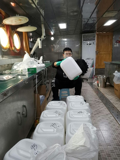 小组的CTD采水作业。CTD指电导率、温度、深度传感器,由于往往与采水设备绑定,其常用于采水作业的代称。作为海沟海域的第一项作业,我们必须要开个好头,“初站”打响,只许成功。 虽然说“初站”刚刚打响,后勤保障工作可是已经开展许久了,商纪元便是这后勤总负责,36桶20L采样桶,36桶20L中转桶一个不落的在短短十几天的航渡途中就必须预备妥当。预备流程俗称“洗桶”,这“洗桶”可不是简单的清洗,浓硫酸浸润,稀盐酸浸泡,去离子水洗净,这再乘以20L的容积,再加上每个步骤中的细心、耐心和用心。商纪元有着山东汉子的高大在身上,可毕竟不是铁打的,这72个桶下来也是肩颈酸痛,只能贴着膏药“初站”了。 商纪元准备采样桶 美人巾帼 “初站”中的别人可以不提,张婉莹可是必须要说的。“科学”号上女生不多,琉璃神社