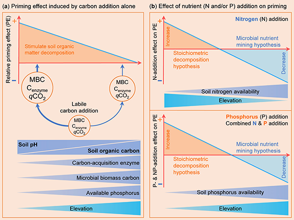 朱彪研究员为论文通讯作者,2017级博士生冯继广为论文第一作者,2019届硕士毕业生唐茂为论文共同作者。本研究受到国家自然科学基金(31988102和31670525)的资助。 论文链接://doi.org/10.1111/gcb.15587 解释激发效应及其对养分添加响应的概念框架