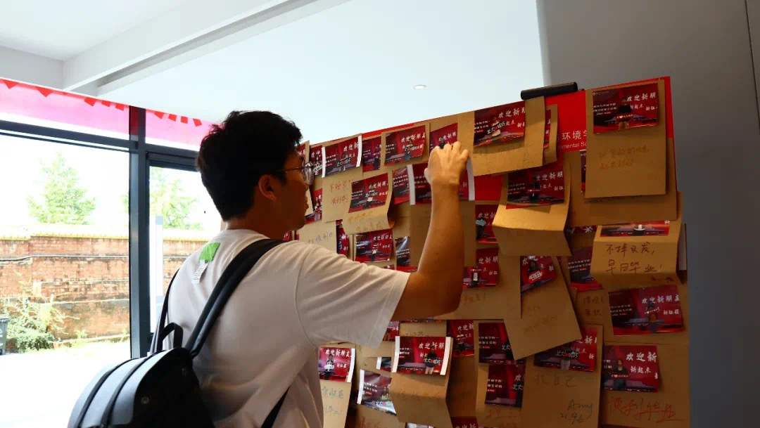 清晨,21级城环研究生迎新报到工作的序幕在淅沥的小雨中悄然拉开。寸阴若岁,崭新的城环新大楼在此刻正静静等待着一张张同样新鲜的面孔的到来。 准备工作 在报到前一天,研究生会各位骨干早已将各类迎新物资准备妥当,并提前进行了接待现场布置与接待流程演练,在保证迎新工作能够顺利、有序、高效完成的同时,力求用最新颖、最有趣的活动带动新生们积极快速地融入到城环大家庭之中。 迎新现场 报到环节 9月6日早上8:30,报到工作正式开始。学院党委副书记张新平老师,团委书记、学工办主任谭卓立老师,团委常务副书记宋宛儒,研究生教务办公室于佳鑫老师以及学工办副主任蔡洪波老师也早早地亲临现场,与大家共同工作,欢迎新生们的到来。新生们在工作人员的指引下有序验证身份、核对报到信息、办理报到手续并领取相关材料,顺利地完成了报到流程。 精彩活动 在本次迎新工作的报到环节,除抽取心愿卡的互动游戏外,学院研究生会骨干们还结合当下时髦的“盲盒”概念与备受大家喜爱的“城小环”形象,别出心裁地设计出了以选取卡套为形式的“盲盒特色任务”,为大家研途生活的开启率先提供了一份小小惊喜。 城环有你,未来可期。新生们手持“我爱城环”、“城环是我永远的家”等具有城环特色的各式标语在迎新背景板前留下了城环研途生活的第一张珍贵影像,并用五颜六色的画笔在一旁书写下对于未来生活的美好期待与向往。 暖心关怀 在迎新过程中,琉璃神社