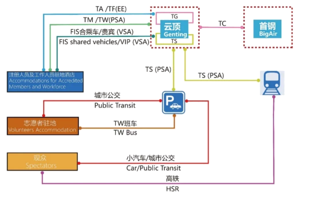 国空规划团队在本阶段工作中的部分成果如下: 1)完成张家口赛区全部4个竞赛场馆、4个非竞赛场馆、北京赛区首钢滑雪大跳台场馆的交通规划设计方案 在大型赛事中,场馆设施及服务是赛事能否取得成功的根本,规划团队在场馆交通设施规划的过程中,充分考虑了参加冬奥会的8类客户群不同的出行特点及出行需求,按照优先级分别设置各客户群的停车场和上落客位;并结合山地场馆的地形地貌、因地制宜安排各类交通设施和交通流线,以满足车辆通行的坡度、宽度等硬件要求;同时按照安保政策和防疫政策的要求,在场馆前后院区域分别设置交通设施,保证闭环内外区域流线不交叉、前后院流线不交叉。 古杨树场馆群 云顶滑雪公园 张家口颁奖广场 张家口冬奥村主入口 张家口冬奥村班车站 北京首钢滑雪大跳台 2)完成张家口赛区8个临时交通场站的规划设计方案 规划团队在张家口赛区临时交通场站的选址及规划设计过程中主要基于以下原则:交通场站结合地形条件,集约用地、减少工程量;考虑车辆出行需求,场站与服务对象驻地就近布置,减少车辆空驶;交通场站与安保政策和防疫政策结合,闭环内车辆与闭环外车辆各自集中,减少场站内不同的交通分区和交通设施需求,集约利用。基于上述原则,团队完成了张家口赛区所有8个临时交通场站的功能安排、场站规模测算、场站选址、场站停车、出入口、功能用房交通设施总平面图布局方案,并在后续施工图设计和实际建设过程中提供了全流程的咨询与对接服务,保障张家口赛区临时交通场站的高标准建设与运营。 交通场站内车行和人行流线示意图 张家口赛区棋盘梁交通场站 张家口赛区冬奥村北交通场站 张家口赛区会展东交通场站 张家口赛区马丈子交通场站 3)完成张家口赛区核心区道路及交通组织整合方案 张家口赛区核心区是张家口赛区所有竞赛场馆和非竞赛场馆所在区域,也是赛区铁路交通枢纽太子城高铁站所在地,是赛事交通出行的重点保障区域。规划团队针对赛事出行需求,对张家口赛区核心区道路交通提出单行组织方案,最大程度减少流线交叉;同时对核心区内各类场馆、场站、高铁站等交通设施出入口与道路的关系、车辆在整合核心区内的运行流线进行全面整合与优化,以减少车辆流线交织、降低与道路连接的出入口等节点的交通拥堵,提高核心区道路及其他交通设施整体运行效率。 核心区交通设施整合图 张家口赛区核心区效果图 02 运营准备阶段 1)张家口赛区核心区各场馆交通组织方案仿真测试 规划团队以赛时各客户群体的交通需求为背景,对赛时交通集疏散方案通过模型仿真的方式进行评估。他们应用PTV Vissim交通仿真软件,结合不同的集疏散方案,对张家口赛区奥运场馆、核心区道路能力、交叉口运行状态、班车上落客位秩序等多方面的运营状态进行仿真运行,依据结果评估集疏散方案优劣性,并加以不断修正,同时提出相应的交通管控和交通需求管理政策建议,为保障赛时交通的良好运营提供依据。 核心区场馆及道路仿真模型 2)张家口赛区系列测试活动及演练活动交通保障支持 规划团队为2021年冬奥会和冬残奥会张家口赛区系列测试活动和相关演练活动提供技术支持,包括测试活动交通运输保障方案的编制、演练活动方案的编制、测试活动和演练活动的现场技术支持等。通过一系列测试活动的举办和实地演练,他们总结了交通保障组织架构、交通运行、场馆交通流线组织等多方面经验,进一步细化了冬奥正赛的交通运行方案,优化了道路交通组织流线、停车场设计、上落客区设计等。 张家口赛区测试活动交通服务模式图 3)张家口赛区太子城高铁站与崇礼高铁站交通运行计划编制 为保障2022年北京冬奥会期间张家口赛区太子城高铁站和崇礼高铁站出行的服务品质和服务效率,规划团队按照站内外全流线的要求,结合疫情防控,重点按人群开展交通组织设计,并在此基础上配合编制两个高铁站的交通运行计划,明确交通保障团队的组织架构、人员点位安排和各类客户群的进出站流线及防疫分区。 太子城高铁站效果图 崇礼高铁站效果图 高铁站隔离护栏 交通保障团队组织架构 03 赛时运营阶段 在赛时运营阶段,规划团队根据编制好的运行方案开展实际交通运行保障工作,并根据抵离计划变更、赛程变化、交通拥堵、恶劣天气等临时状况,应急调整运行方案,完成交通服务。 冬奥会期间,规划团队全程参与了张家口赛区交通保障的组织工作,还得到2008年北京奥运会交通专家金砚铭主任的现场指导。 团队参与冬奥交通组织技术服务 受疫情影响,本届冬奥会组织面对不同以往的特点和挑战。北大城环交通专家在为这届特殊的冬奥会提供咨询和服务的同时,也收集第一手的运行数据,为特殊情况下大型赛事的交通组织与交通设计积累经验,争取未来在这一领域持续贡献自己的一份力量。