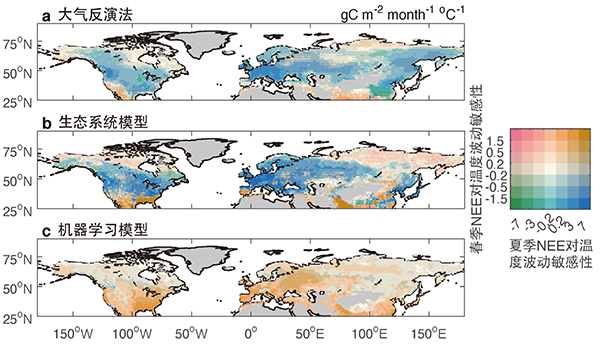 2020级博士生王锴为第一作者,朴世龙院士为通讯作者。 图1. 北半球陆地净生态系统碳交换量(NEE)对春、夏季温度变化响应的空间分布。正值表示升温抑制陆地碳汇,负值表示升温促进陆地碳汇。