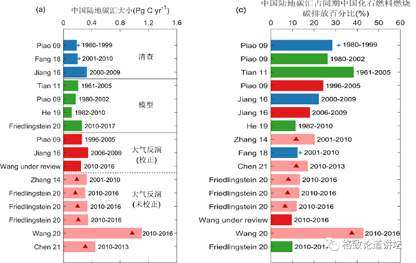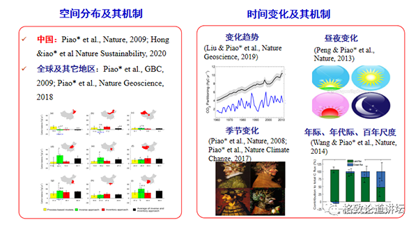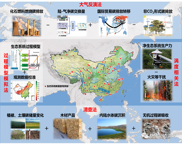▲数据来源:NOAA 这个视频是不同二氧化碳浓度观测站的二氧化碳浓度的变化。横坐标是这个站点分布的纬度,0代表赤道地区,右边是北半球地区,左边是南半球地区。我们可以看出来二氧化碳浓度是逐渐地上升的,但是每个站点的上升规律是不一样的,在南半球和赤道地区,二氧化碳浓度稳定上升,而在北半球的大部分站点是夏天的时候浓度低,而到了冬天以后,它的浓度是非常高的。主要的原因是什么呢?因为在夏天,生态系统进行光合作用吸收了大量的碳。所以我们可以看出来,陆地生态系统确实在减缓温室气体浓度上升中起着不可忽视的作用。 全球的碳计划每年会对过去10年的全球碳收支进行评估,从2011年到2020年,我们人为排放了大概400亿吨的二氧化碳,但是只有48%在大气里边累积,剩下分别有26%被陆地和海洋所吸收。 需要强调的是,我在陆地生态系统中给出来的是剩余碳汇,为什么呢?因为我们的陆地空间太复杂了,异质性太大了,所以现在还没有很好的方法可以完全准确地估算出全球的陆地碳汇到底有多少。所以在全球碳计划的时候,我们把总排放量计算出来,再把大气生态系统的部分算出来,海洋生态系统的部分算出来,然后认为剩下的应该是全球陆地生态系统的部分。但是这会导致一个问题,那就是陆地生态系统碳汇的量会受到其他几个部分的估算精度的影响。如果我们把其他部分的排放量高估了,那么陆地的碳汇也有可能会被高估。 ▲全球碳循环研究的两个关键问题 全球碳汇我们还可以这样算出来,但是如果到具体到某一个区域的时候,我们是无法用这种间接的方法去计算的。所以全球碳计划有两个核心的关键问题,26%的碳分布在哪儿?分布在美国还是在中国?这是一个核心的问题。另外一个核心的问题是碳汇随时间怎么变化?未来还会不会增加,比如增加到40%或50%?我们当然希望未来碳汇会增加,这对我们碳中和是非常有利的。 影响中国陆地碳汇的因素有哪些? 我们的课题组在过去20年,围绕这两个核心的问题进行了研究。接下来,我重点介绍一下中国的碳收支方面的研究。 我们为什么要研究这个区域的碳收支的呢?这是因为通过将区域的碳排放、吸收与全球大气中的二氧化碳浓度的增加联系起来,可以帮助确定碳补偿、减缓的政策。比如说像《京都议定书》里边提到的,如果一个国家通过植树造林吸收了更多的碳,那么就有权排放相应的碳。 因此,在科技部和基金委的支持下,我们国家在过去几十年开展了大量的研究,也为我国达成碳中和目标和参与全球气候治理提供了关键的科学支撑。 我们先看一看影响区域碳收支的影响因子有哪些。首先是土地利用的变化,在过去50年,我国75个城市的建成区面积增加了7倍左右,大家可以看一看你们所在的城市面积到底有没有变化。比如我们可以看到吉林城区基本上面积是没有变化的,而深圳的面积增加是非常大的。这种城市化的扩张会破坏自然的植被,导致碳储量流失。 中国的城市化还有一个很重要的特征,那就是农村人口向城区里边移动。这一现象对农村地区植被的破坏会相对少一些,有利于农村地区的植被的碳吸收。 另外,我们国家在过去几十年进行了大量的生态工程,包括陕北防护林等。全国的森林覆盖率由20世纪80年代初的12%,提高到目前的23%,森林蓄积量提高到了175亿立方米。我们还是全球人工林面积最大的国家,占据全球人工林面积的25%左右。所以我国大量的植树造林工作有利于陆地碳吸收,有利于生态系统的碳汇功能。 但是另一方面,我们还经历着气候变化。1901-2020年,我们国家的温度平均每10年升高0.1度。温度变化一方面有利于生态系统碳吸收,延长物候生长季的时间;但在另一方面它又是不利的,因为会加快生态系统的呼吸,比如加快植物的呼吸和土壤有机质的分解。所以,温度上升对中国生态系统碳循环到底会产生怎么样的影响,现在还存在很大的不确定性。 除了温度变化以外,我们国家的降水格局也发生了变化。我们国家现在经历着南涝的问题,如果我们看过去几十年的降水量变化的话,可以发现我国南方的降雨量是增加的,北方地区的降雨量是下降的。北方本来就缺水,因此对植被生长来说,降雨量下降是不利于生态系统碳吸收的。 二氧化碳浓度上升虽然会导致气候变暖,但对植被来说却是有利的。为什么呢?我们知道,二氧化碳是光合作物的底物,光合作用的底物增加了,光合作用的速率就会加强。目前遥感数据发现,全球植被生长率是显著增加的,叶子面积的增加量大概相当于亚马逊雨林的面积,科学家认为这一现象是二氧化碳浓度上升导致的。 另外,大气中氮的沉降也会有利于生态系统的碳的吸收。对于植被的生长来说,整个北半球的土壤里边缺氮,所以农民经常施氮肥,以便提高农作物的产量。因此大气的氮沉降也会导致植被的生产率提高,从而有利于生态系统的碳吸收。 还有一个影响因素是气溶胶,也就是我们经常提到的雾霾。雾霾对人体健康是不利的,但是目前的研究表明,雾霾对植被的生长和生态系统碳汇来说是反而是有利的。像中国科学院植物所刘玲莉老师他们研究发现,在阴天,植被的光能利用效率提高,生产力反而更好。 还有在1991-1992年左右,其实当时我们人为的碳排放量是大于70年代和80年代的,但是大气中的二氧化碳浓度基本没有增加。这是什么原因呢?其实这和1991