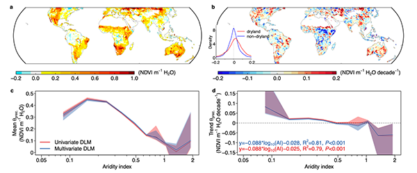 张尧课题组,基于长时间序列遥感数据和动态线性模型等统计方法,量化了全球中低纬度地区植被对降水的敏感性的空间格局及其变化趋势。研究发现,自1980年以来,干旱区植被对降水的敏感性不断增加,而湿润地区植被对降水的敏感性不断下降(图1)。进一步结合陆面过程模型和考虑CO2影响的极简水文模型,研究得出大气二氧化碳浓度升高是导致这一现象的主要原因。二氧化碳施肥效应会通过减少气孔导度减弱生态系统需水量,体现为湿润地区植被与降水的进一步解耦和植被对降水敏感性的下降。但同时,在干旱区二氧化碳会极大促进植被生长,增加生态系统叶面积,这一影响超过植被通过气孔调节带来的节水效应,总体表现为植被与降水的更强耦合和干旱区降水敏感性的增强。 图1. 植被绿度对降水敏感性的平均大小(a, c)及其长期趋势(b, d) 这一研究为二氧化碳施肥效应对生态水文过程的影响提供了直接观测证据,并有助于理解气候变化背景下干旱区植被变化及其对干旱等极端气候的响应。 该成果近期以“Increasing sensitivity of dryland vegetation greenness to precipitation due to rising atmospheric CO2”为题发表于Nature Communications杂志(DOI: 10.1038/s41467-022-32631-3)。琉璃神社