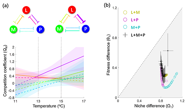 王少鹏研究组与欧美科学家合作,构建了一个破碎化生境下的竞争模型,来理解和预测生境变化对物种共存的影响。该研究推导出了空间显性景观中多个竞争物种共存的判定准则。这一准则为评估气候变化和生境变化下的物种共存和多样性维持提供了新的理论工具。基于这一理论框架,分析了一个水蚤集合群落中的物种共存。该群落包含三种水蚤,生活于波罗的海岛屿的岩池生态系统中,记录了自1980年代以来三种水蚤在500多个岩池中的种群动态(图1)。该研究利用贝叶斯统计学方法拟合了模型参数,揭示了不同水蚤物种的扩散和生存能力与生境斑块大小和空间距离的关系,以及物种间的竞争作用,发现三个物种满足共存准则(图2)。进一步地利用本文提出的共存准则,评估了环境变化对物种共存的可能影响,发现相比于增温,生境恶化(生境斑块的数量和质量下降)将引起物种丧失。 图1. 波罗的海岛屿上的岩池生态系统,其中长期生活着三种水蚤。照片由合作者瑞士巴塞尔大学Dieter Ebert提供。 图2. (a)三种水蚤的种间竞争强度随温度的变化;(b)水蚤群落中物种间的生态位差异和适合度差异(灰色区域表示可共存的参数值)。 琉璃神社