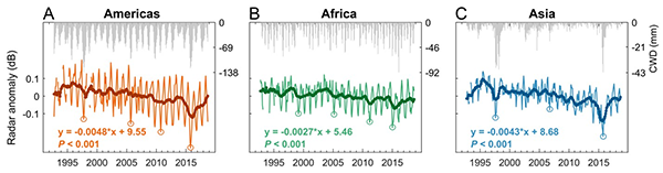 生态研究中心陶胜利课题组开发了全球首套C-波段、长时间序列卫星雷达信号数据集,首次研究了未被砍伐热带雨林在过去30年里的连续干旱响应。C-波段雷达信号与传统光学信号不同,能够穿透雨林上空浓厚的云层。研究发现,截至2018年,全球未被砍伐热带雨林的雷达反射信号在持续降低,且超强干旱事件造成了至今未恢复的信号突降。信号降低的程度在美洲雨林最为严重。这样的持续降低趋势并未被传统光学遥感数据所捕捉。进一步,该研究从雷达信号中提取了雨林对每次干旱事件的抵抗力(resistance)与恢复力(resilience),发现大多数雨林对干旱的抵抗力在降低,恢复力降低或者没有明显变化。因此,如果未来发生强干旱事件,雨林的雷达信号很可能继续下降。这些结果表明全球未被砍伐热带雨林抵御未来干旱的能力是有限的,同时间接表明,如果要完成巴黎协定的目标,不能仅依赖基于自然的气候解决方案(nature-based climate solution)。 图1. 全球现存雨林(截至2018年)的雷达信号与水分亏缺序列。图上部的灰色线代表水分亏缺状态,图中部的彩色线代表雷达信号。圆圈标出了因极端干旱事件而导致的信号突降。 陶胜利研究员为第一兼通讯作者,法国科学研究中心Jeorme Chave教授为共同通讯作者,其他合作者来自美国NASA、法国航天局、瑞士GAMMA遥感中心等。该研究受到了法国 Agence Nationale de la Recherche、欧空局BIOMASS碳卫星、法国航天局博士后项目、国家自然科学基金委基础科学中心项目(31988102)等的资助。文章链接://doi.org/10.1073/pnas.2116626119 琉璃神社