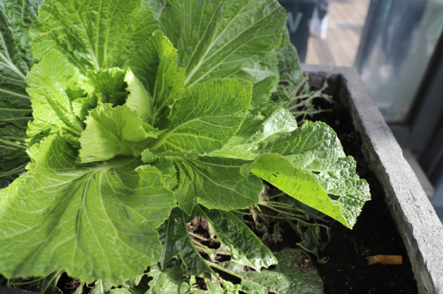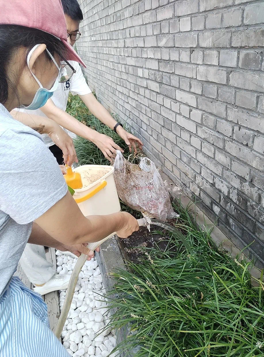 在家园食堂露台种植的白菜是由幼苗移植过来的,这一步需要十分严谨且专业的操作。生命科学学院的苏都莫日根老师在北大开设了一门“大学生种植实践”通选课,对种植教学拥有非常专业的经验,同学们便邀请他来进行指导和帮助。在移植两三天后,确认白菜幼苗已经成活,这片“试验田”便全权交由“林歌”计划的同学们负责管理。