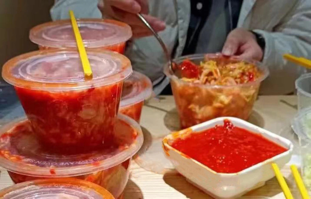 另一批则被用作了“辣白菜”的原料。在筛选和清洗之后,一层白菜一层盐,析出水分,密封后置于阴凉处,先给美味一点沉淀的时间。待水分析出、将表面盐分洗去后,便是辣酱的均匀涂抹、分装成盒。涂抹时,空气中香气四溢(以至于做辣白菜的同学们不时地忍不住偷尝一片)。一盒盒美味使人垂涎欲滴,俱是人间烟火气。