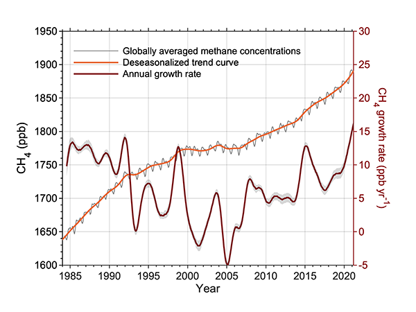 甲烷是一种重要的温室气体。自工业革命以来,大气甲烷浓度增加了2倍,在所有温室气体的辐射强迫中占比三分之一。要实现《巴黎协定》的温室气体减排目标,将全球温升控制在2 °C以内,削减人为甲烷排放降低大气甲烷浓度迫在眉睫。近十五年大气甲烷浓度呈现增长加速的趋势,2020年甚至达到了1984年以来有站点观测记录的最大值。如果未来大气甲烷浓度持续加速增长,将会对减排和巴黎协定温控目标的实现带来严峻挑战。因此,亟需回答大气甲烷浓度为什么近期增长加速这一国际难题。 大气甲烷浓度增速主要受人为源排放、自然源排放和大气汇共同控制,然而由于这三部分估算的不确定仍难以对大气甲烷浓度增速进行归因,尤其是大气汇的贡献最具挑战。2020年由于新冠疫情的蔓延及各国防疫措施的实施,人为甲烷排放有所降低,但大气甲烷浓度却反而飙升,提供了控制人为排放研究大气甲烷浓度的完美“实验”。 图1 大气甲烷浓度观测曲线。灰色为观测值,橙色为趋势线,棕色为增速 面对上述挑战和机遇,琉璃神社