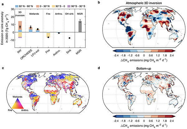 彭书时研究团队与多所国内外研究机构合作,基于大气甲烷浓度观测、能源和农业清查数据、气象和遥感等多源数据,利用湿地过程模型、大气化学传输模型和大气反演模型,结合“自下而上”和“自上而下”的温室气体源汇评估方法,探究了2020年大气甲烷浓度飙升之谜。 研究发现,相比于2019年,2020年人为甲烷排放减少了1.2百万吨,火灾甲烷排放减少了6.5百万吨。2020年更暖更湿的气候使得湿地甲烷排放增加了2.5 – 9.4百万吨,主要源自高纬度湿地和北半球热带湿地。然而,湿地排放增加量的最大值(9.4 百万吨)仍不足以解释2020年大气甲烷浓度的飙升,暗示着甲烷大气汇在2020年可能减少。 大气甲烷主要通过与大气对流层中的OH自由基反应来移除。OH自由基寿命极短,难以直接测量,是研究大气甲烷汇变化最为棘手的难题。研究发现,由于2020年新冠疫情人为排放的氮氧化物减少,由大气化学传输模型模拟得到的对流层OH自由基浓度平均减小了1.6%,这与另一种基于大气中三种氟化气体浓度反演得到的OH自由基的变化相吻合。2020年大气OH自由基浓度降低导致了大气甲烷汇减少了7.5百万吨。 研究进一步发现,由“自上而下”评估方法得出的甲烷排放变化空间格局与“自下而上”的结果相一致,佐证了自然排放增加由湿地排放增加主导。因此,2020年大气甲烷浓度增长加速一半归因于由湿地主导的自然排放增加,另一半归因于对流层OH自由基浓度的降低。 该研究为理解全球的甲烷收支提供了新见解,揭示了湿地甲烷排放对实现全球温控目标不可忽略,并认识到未来甲烷减排计划需要同时考虑氮氧化物等人为污染物排放趋势变化所导致的大气甲烷寿命变化,为《巴黎协定》的温升目标实现和全球甲烷减排承诺提供了科学依据。 图2 2020年大气甲烷浓度飙升的归因。相比于2019年,a, 2020年大气甲烷浓度增长加速的归因;b,基于“自上而下”大气反演方法估算的甲烷排放变化的空间格局;c,2020年甲烷排放变化主导源的空间格局;d,“自下而上“方法估算的甲烷排放变化的空间格局。 研究成果以“湿地排放和大气汇的变化解释了2020年大气甲烷浓度增加(Wetland emission and atmospheric sink changes explain methane growth in 2020)”为题,于2022年12月15日发表在《自然》(Nature)上,琉璃神社