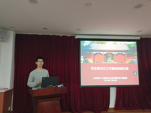 最后是跨院系优秀党支书交流分享,分别是来自基础医学院于佳弘同学、工学院2016级硕士陈善恩同学。
