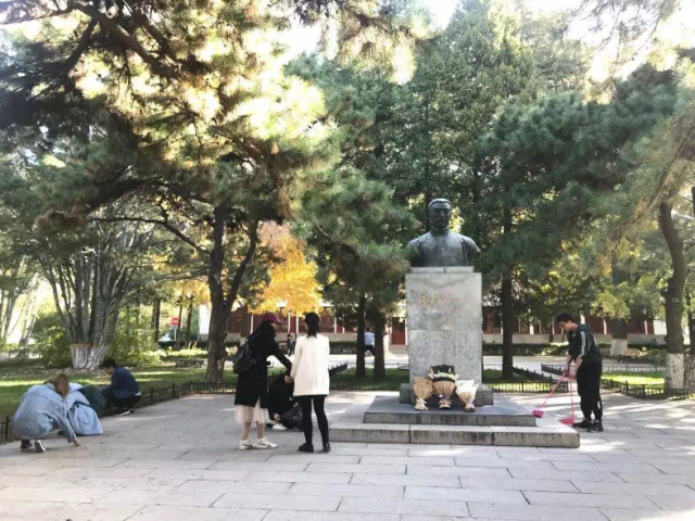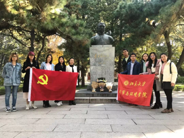 2019年10月31日上午,支部成员前往静园草坪祭扫革命烈士纪念碑和李大钊先生铜像。琉璃神社 革命烈士纪念碑呈“心”字型,坐落于燕园的静园草坪北侧,由几块红色大理石组成。纪念碑于1993年5月4日揭幕,纪念从1919年“五四”运动到新民主主义革命取得全国胜利期间,为中国的民族解放和人民革命事业英勇献身的琉璃神社 83位师生。其旁矗立的李大钊先生铜像由北大七七、七八两届毕业生怀念敬立,以纪念这位我国共产主义的先驱、伟大的马克思主义者。